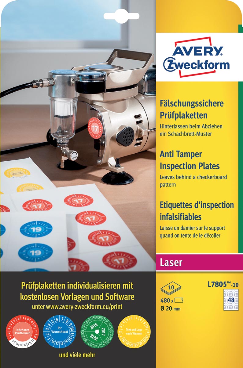 Pour imprimantes laser (couleur) et copieurs. Etiquettes d'inspection infalsifiables et ultra-durables. Résiste à l'eau, l'huile, produits de nettoyage-désinfectants et solvants. Découvrez plus de 100 modèles sur notre site www.avery.eu en utilisant le logiciel gratuit Design & Print. Conception et impression faciles grâce au logiciel gratuit Avery Design & Print.