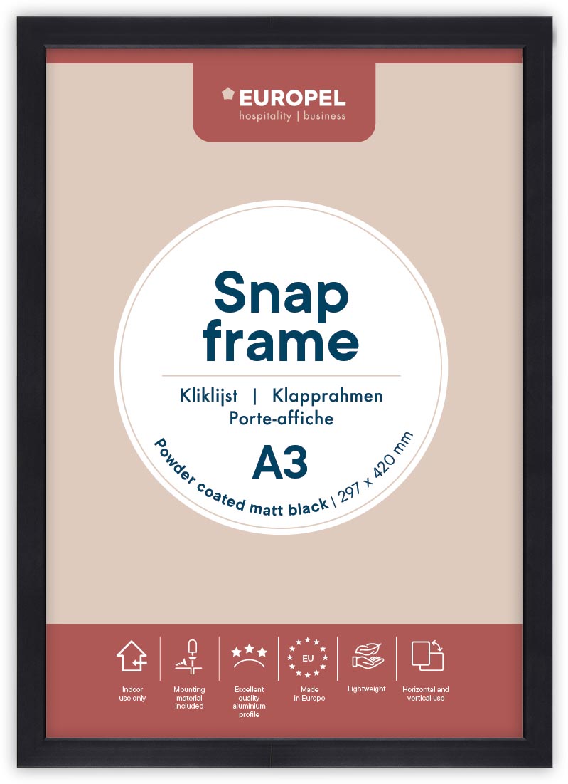 Donnez à vos affiches l'attention qu'elles méritent avec notre cadre clipsable revêtu d'une couche de poudre noire, la combinaison parfaite d'un design luxueux et d'une haute qualité. Qu'il s'agisse de présentations commerciales, d'affichages publicitaires ou de panneaux d'information, ce cadre clipsable assure un aspect élégant et professionnel.Pourquoi choisir notre cadre noir luxueux?* L'aspect luxueux et le design durable - Le cadre mat avec un profil unique dégage une grande classe et offre une résistance supplémentaire.* Changement ultra rapide grâce au système Easy-Click - Remplacez vos affiches en un rien de temps, sans outils.* Aluminium anodisé de qualité supérieure - Résistant aux rayures, robuste et conçu pour durer des années.* Clair et protégé - Le film frontal antireflet protège vos affiches de la saleté et de l'humidité, sans reflets.* Profil d'angle élégant - Une finition raffinée qui n'est pas seulement esthétique, mais qui offre également une stabilité supplémentaire.* Convient aux affiches A3 (29,7x42cm) - Idéal pour les bureaux, les magasins, les restaurants et les espaces publics.* Epaisseur du profil de 11mm - Design élégant et stylé qui s'intègre parfaitement dans une variété d'environnements.* Choix entre le noir intemporel et le blanc élégant - S'intègre parfaitement dans tous les intérieurs.* Montage facile - 4 vis et chevilles incluses pour une fixation sûre.