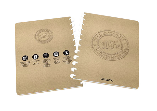 * Enfin le classeur à anneaux A4 biodégradable avec 144 pages à carreaux (4x8mm), papier d'écriture PEFC 90gr ultra blanc, sur lequel chaque stylo se sent à l'aise, qui peuvent être facilement changées, ajoutées ou enlevées grâce aux 12 anneaux ADOC. * Les anneaux ADOC BIO sont biodégradables et ne sont donc disponibles qu'en blanc. Ils offrent un rayon de rotation de 360°, ce qui permet de gagner de la place. * Couverture en carton kraft brun.