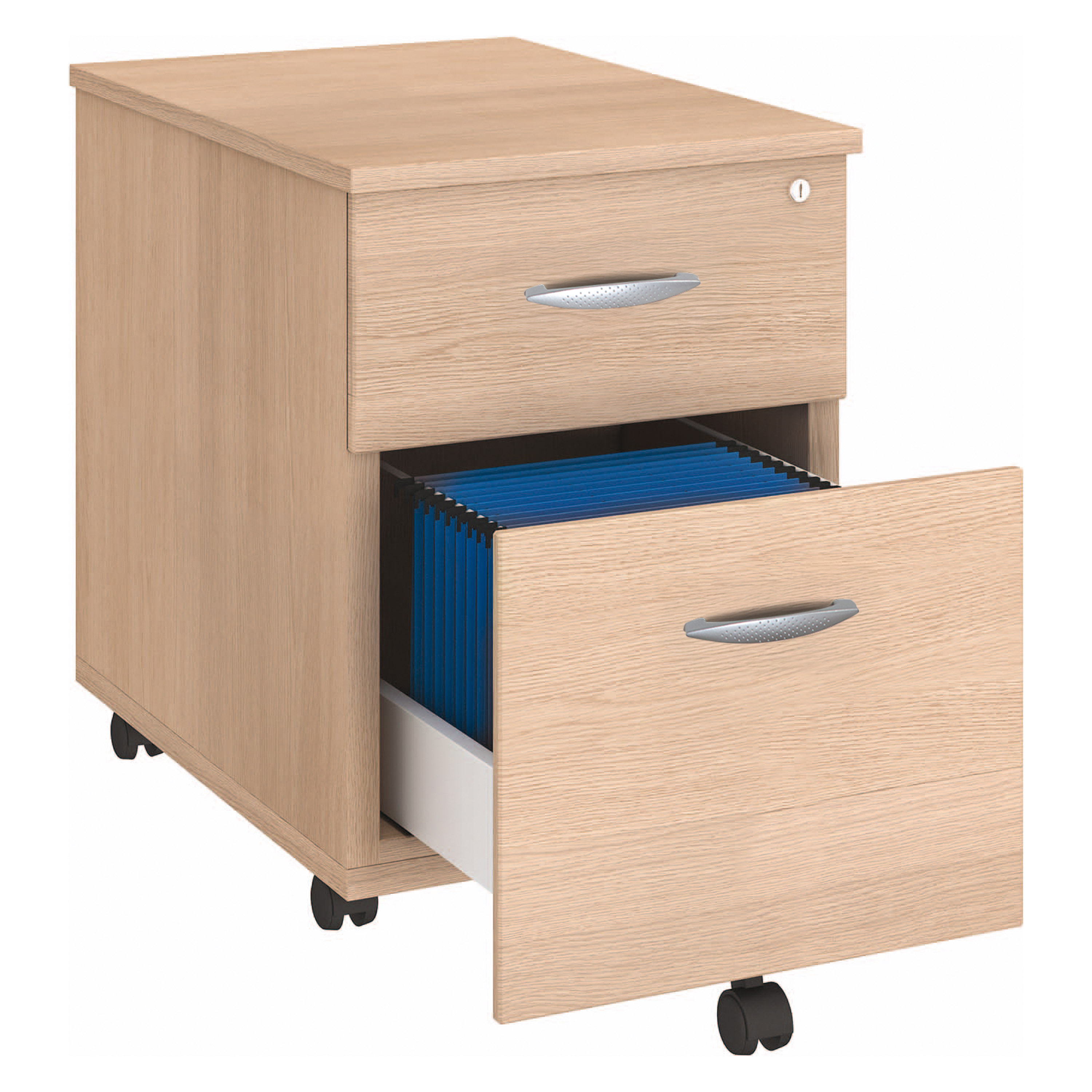 Esthétique, le modèle possède des poignées métalliques en finition aluminium qui font ressortir leur forme ergonomique. Afin de sécuriser vos documents, il suffit de fermer le caisson par son système de verrouillage centralisé (2 clés fournies).