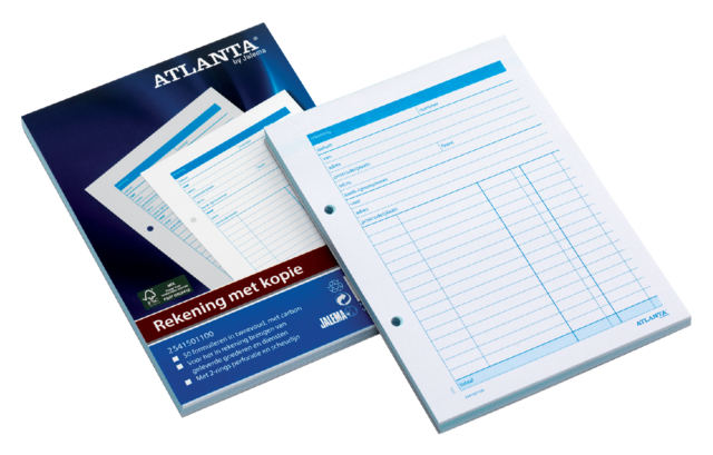 Avec le bloc de factures Djois Atlanta A5, vous facturez facilement vos biens et services. Ce bloc de factures haut de gamme est conçu pour les professionnels qui recherchent clarté et facilité dans la tenue de leur administration. * Caractéristiques du produit ;* Pour facturer les biens et services fournis, avec texte en néerlandais. * Doté d'une perforation à 2 anneaux et d'une microperforation. * Papier carbone inclus : le papier carbone se trouve à l'arrière du carnet, ce qui vous permet de faire facilement des copies de chaque transaction. * Les originaux sont blancs, tandis que les copies sont bleues. * Format : A5. * Fabriqué à partir de papier certifié FSC® 70 g/m².