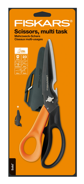 * Les ciseaux Fiskars Cuts and More sont des ciseaux universels pour droitiers avec une prise en main ergonomique qui ne devraient pas manquer dans la cuisine, le jardin ou le garage : vous pouvez non seulement découper avec, mais aussi couper du fil de fer, décapsuler ou les utiliser comme couteau lorsque vous desserrez les lames. * Fonctions : couteau, décapsuleur, coupe câble électrique, coupe ruban adhésif, affuteur de ciseaux, coupe fil. * La lame revêtue de titane est trois fois plus dure que l'acier. * Résistant au lave-vaisselle.