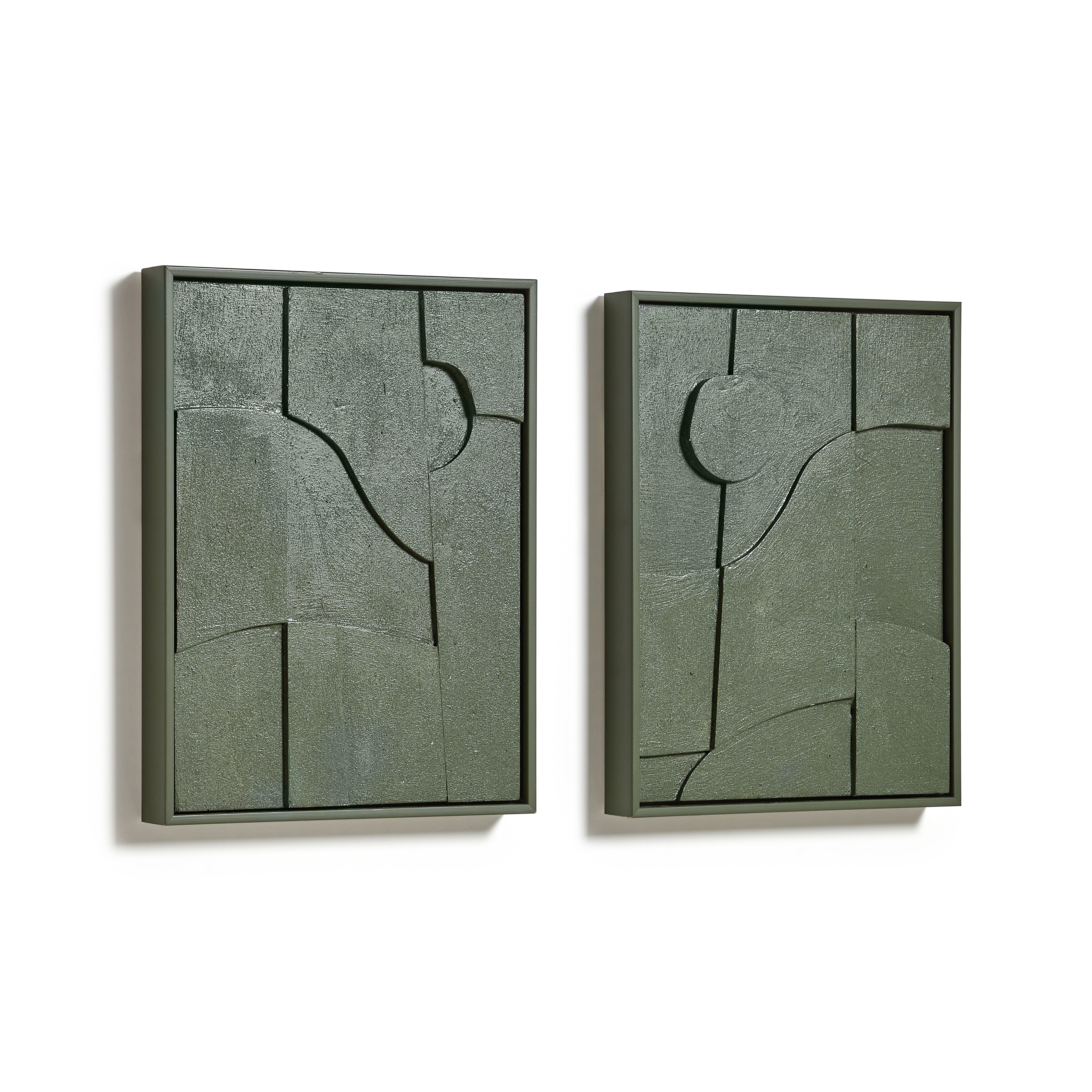 Transformez la déco de vos espaces sans aucun effort. Avec les tableaux Talin aux formes géométriques avec texture et relief, vous ajoutez style et tendance à vos murs. Qui a dit que la géométrie était ennuyante ?- Ensemble de 2 tableaux aux reliefs abstraits en vert.