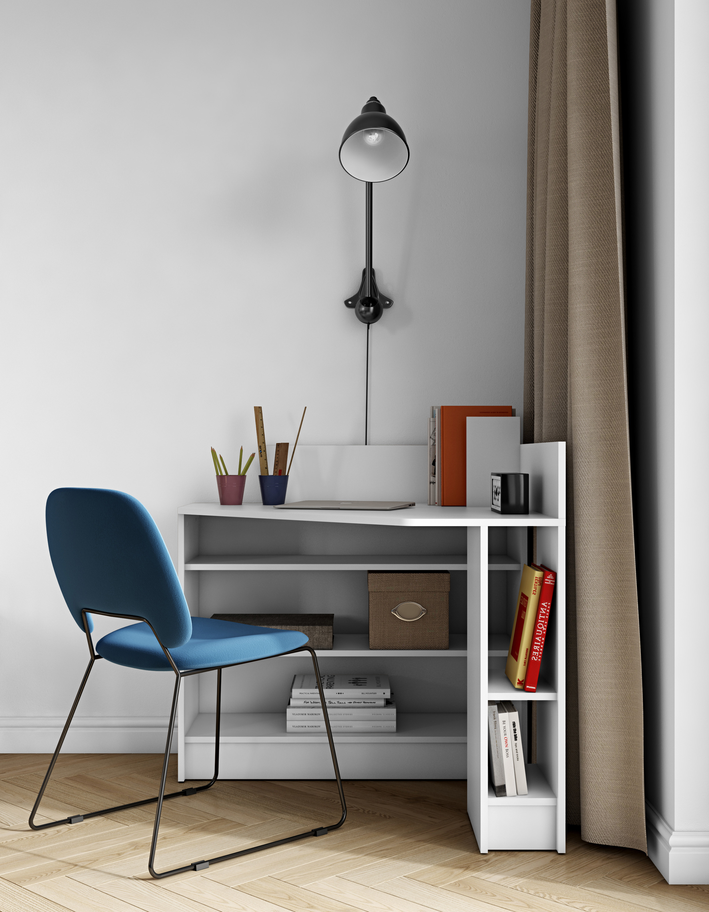 Mit offenen Aufbewahrungsmöglichkeiten und drei vertikalen Regalen oben drauf zum Ordnen Ihrer Dokumente oder Aufbewahren Ihrer verbundenen Geräte passt er sich Ihren Bedürfnissen und Wünschen an.