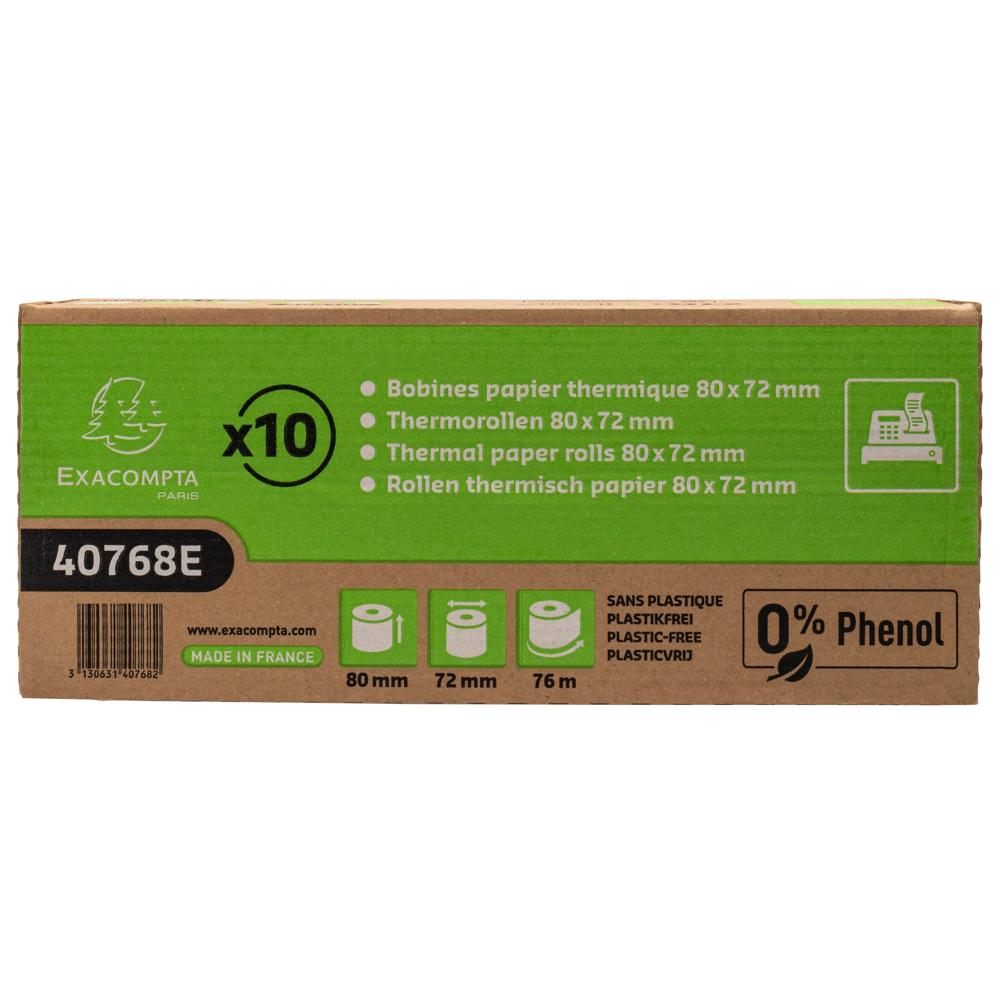 Garantiert phenolfreies Papier, d.h. ohne Bisphenol A, aber auch ohne Bisphenol S. Der Hinweis 0% Phenol, das FSC-Logo und das Exacompta-Logo sind auf der Rückseite des Papiers aufgedruckt.