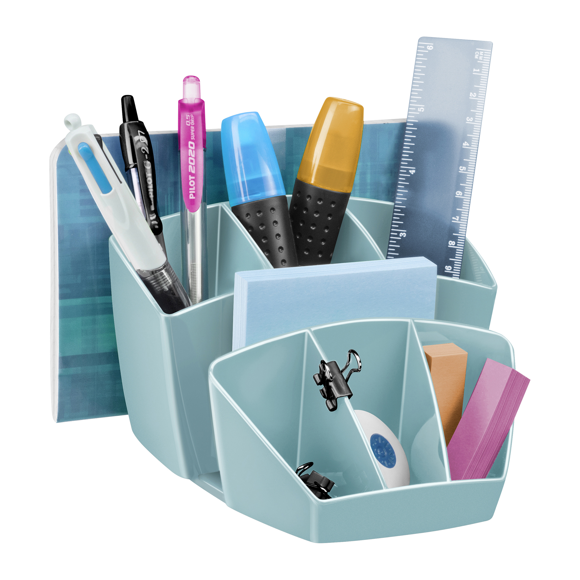Praktisch, er besteht aus 6 Fächern, von denen 3 dem Schreiben gewidmet sind und die anderen 3 für kleine Gegenstände wie Büroklammern oder Radiergummis bestimmt sind.