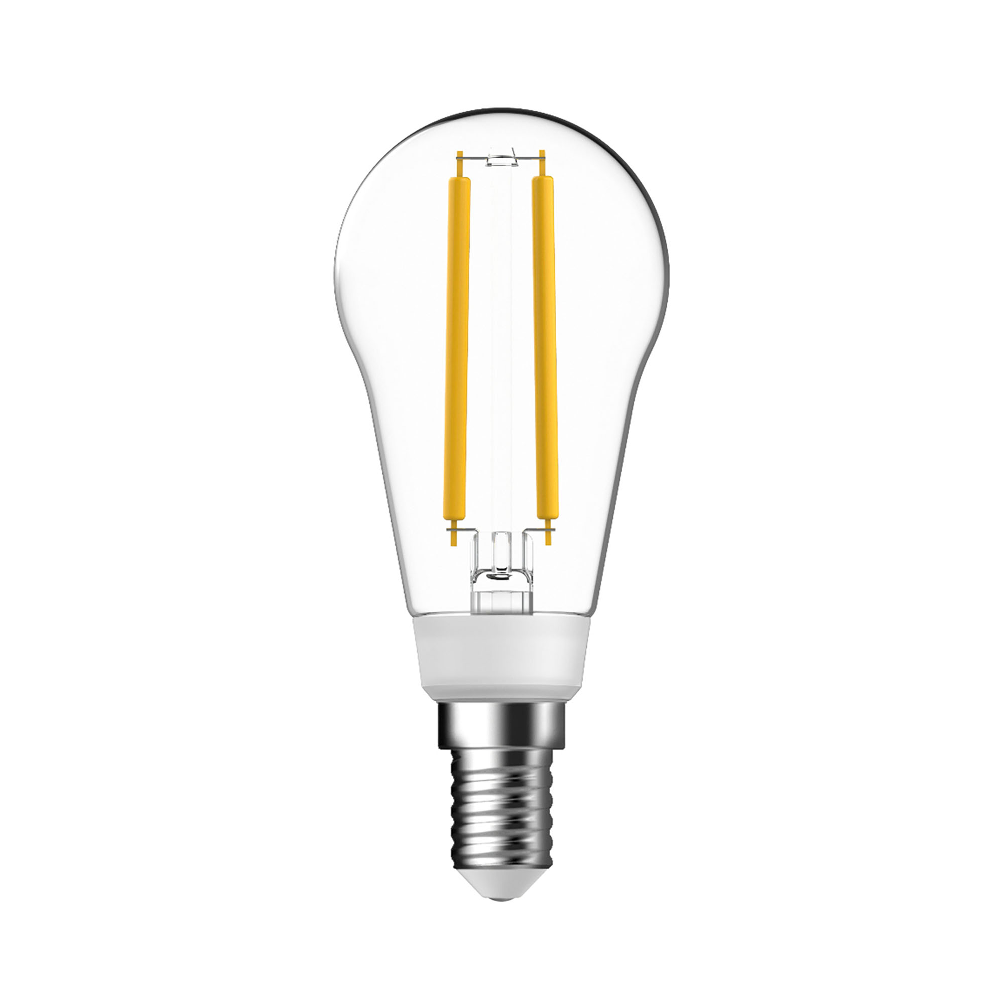 - Ampoule mini-globe transparente avec un culot E14 et une lumière chaude.