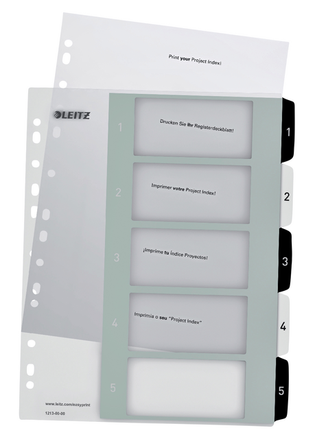 Detaillierte BeschreibungTable des matières imprimable PC sur www.leitz.com/easyprint. Robustes et durables avec PP résistant de 300 microns. Le format A4+ (30,5 x 24,5 cm) permet un accès rapide même en utilisant des pochettes. Perforation 11 trous.