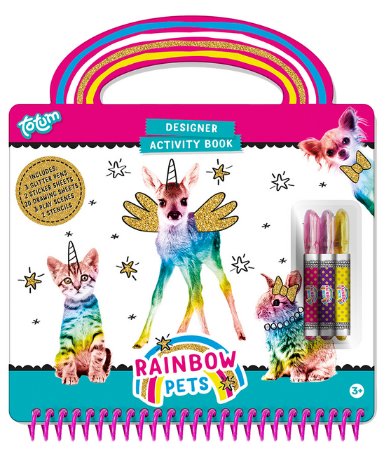 * Livre de dessins et d'activités Rainbow Pets comprenant 3 stylos gel, des autocollants et des modèles. * Livré avec couverture rigide, reliure à anneaux, poignée de transport - pour la maison et l'extérieur.