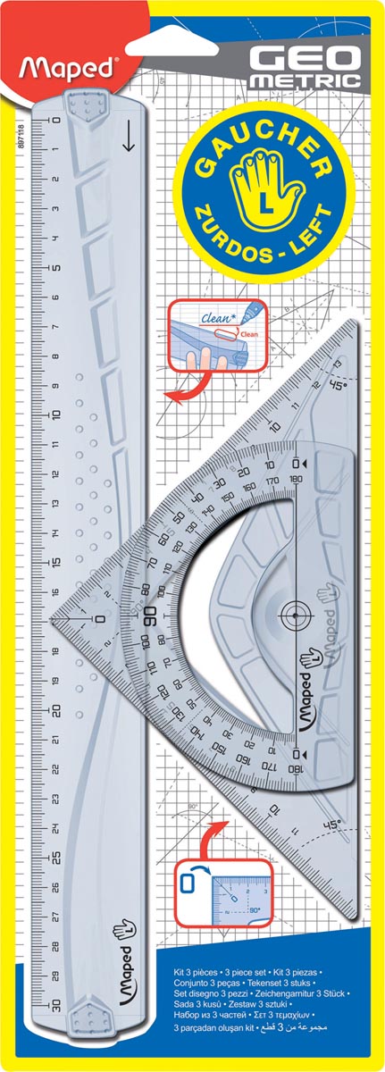 Detaillierte BeschreibungKit gaucher 3 pièces: 1 latte de 30 cm, 1 équerre 45°/21 cm et 1 rapporteur 180°/12 cm.