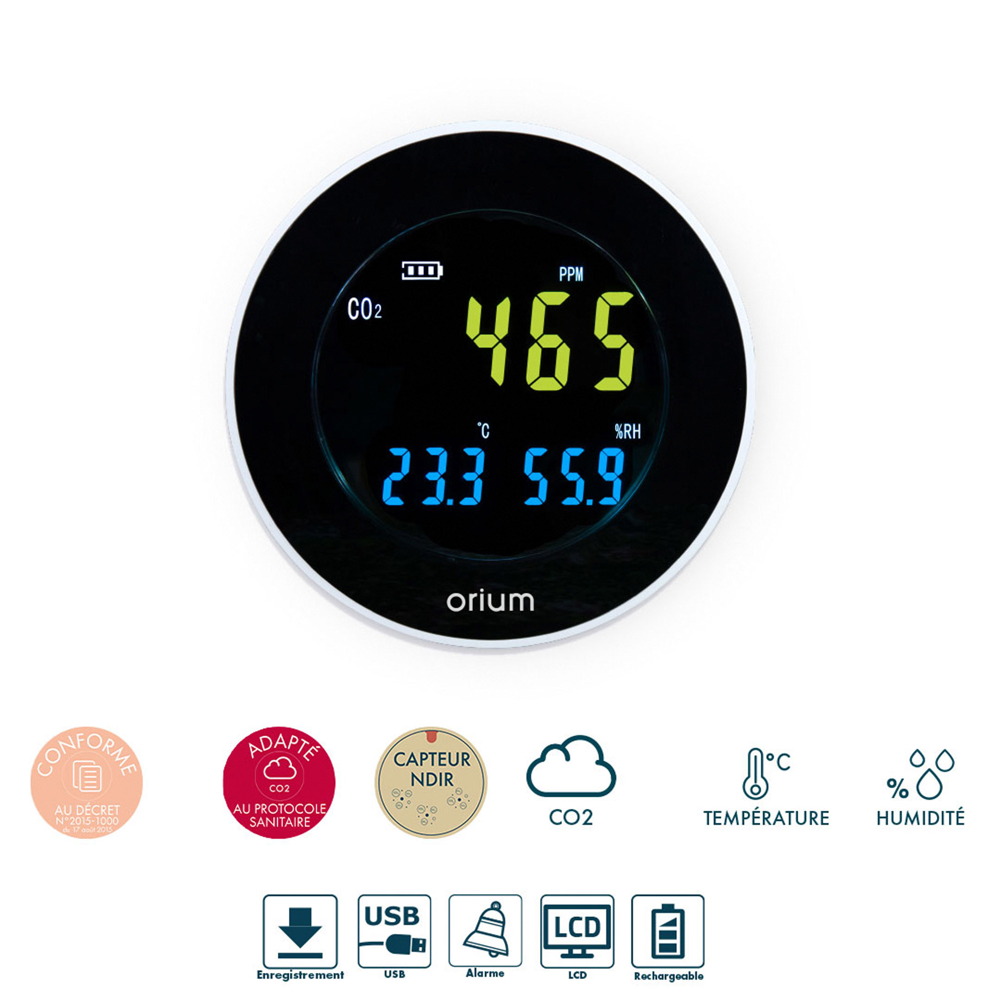 Dans le cadre de la lutte contre le COVID-19, le Haut Conseil de la Santé Public recommande d’assurer le renouvellement régulier de l’air des locaux (avis du 14 octobre 2020). La mesure en continu de la concentration en dioxyde de carbone (co2), à l’aide de capteurs, permet d’en juger la qualité. Il mesure et affiche en continu les valeurs de co2 de la pièce (valeurs indiquées : jusqu'à 9999 ppm).