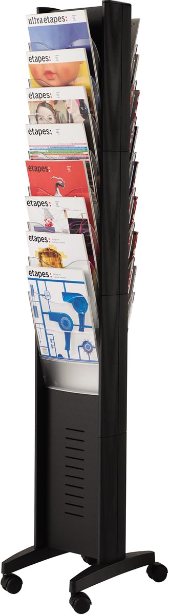 Pesant 12,65 kg, ce porte-prospectus est facile à déplacer grâce aux quatre roulettes dont il est équipé, offrant une mobilité pratique pour exposer vos documents où vous le souhaitez. De plus, sa couleur noire s'intègre harmonieusement dans tout type d'environnement professionnel.