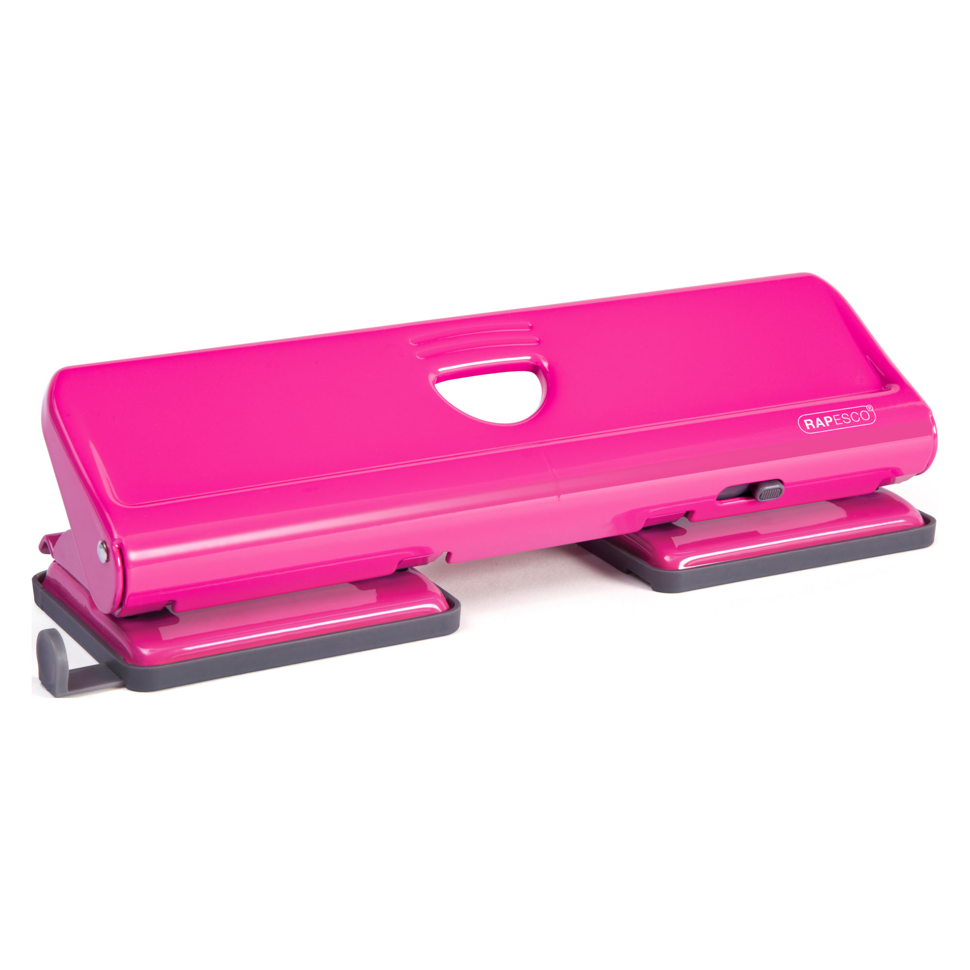 Locher von Rapesco mit 4 Metalllöchern. Dieser Locher hat eine Kapazität von 22 Blättern mit standardmäßigem Lochabstand von 8 cm und einem Lochdurchmesser von 6 mm. Elegant, dieser Locher verfügt auch über eine Skala, einen Verriegelungsgriff für einfache Aufbewahrung und ein Kästchen für Abfallpapier, das teilweise geöffnet werden kann, um ein Verschütten der Lochreste zu vermeiden.