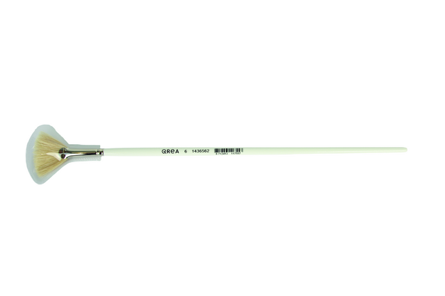 Pinceau éventail Qrea en soie de porc n° 6 - Ø 45mmLe pinceau éventail de Qrea est un outil efficace pour les artistes qui travaillent avec des peintures à l'huile ou à l'acrylique. Grâce à ses poils en soie de porc naturelle, ce pinceau offre une absorption invisible de la peinture et une excellente dispersion, idéale pour créer des textures fines et des transitions douces. Le long manche en bois blanc s'adapte confortablement à la main et assure un contrôle précis pendant la peinture. Grâce à sa grande élasticité et à sa capacité à conserver sa forme, le pinceau reste de qualité même lorsqu'il est utilisé de manière intensive.Caractéristiques :* Type : pinceau éventail n° 6.* Forme : éventail.* Diamètre : 45mm.* Longueur des poils : 22mm.* Type de poils : soie de porc naturelle.* Manche : long manche en bois blanc.* Convient pour : peintures à l'huile et acryliques.* Origine : fabriqué en Allemagne.