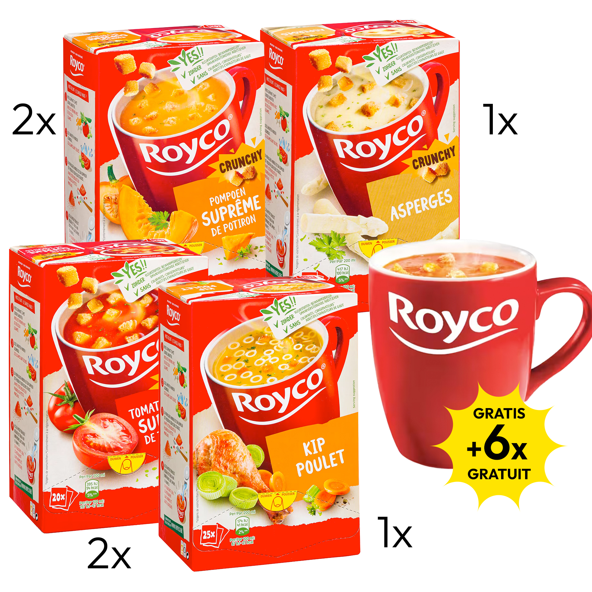 Detaillierte BeschreibungInstant Suppe. Schnell, einfach und lecker.Dieses Paket enthält2 x Bigbox mit Kürbissuppe2 x Bigbox Tomatensuppe mit Bällchen1 x Bigbox mit Hühnersuppe1 x Spargelsuppe+ 6 Tüten Royco GRATIS