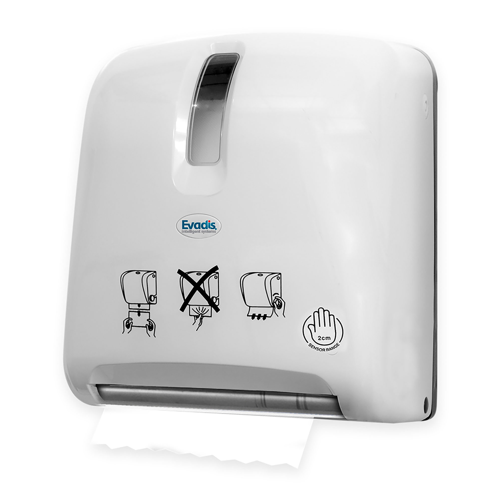 Ultrahygienisch, Ausgabe über Infrarotdetektion. Blatt-für-Blatt-Ausgabe, ökonomisch. Tuchlänge anpassbar: 20, 24, 28 oder 32 cm. Für Rollen bis zu einem Durchmesser von 19 cm und einer Breite von 20 cm. Sichtbares Füllniveau. Weißes Gehäuse, Kunststoff-ABS, Schlüsselschloss. Wandbefestigung (inklusive Schrauben). Dimensionen: H 25,5 x B 36,5 x T 38,5 cm. LR20-Batterien erforderlich, nicht im Lieferumfang.