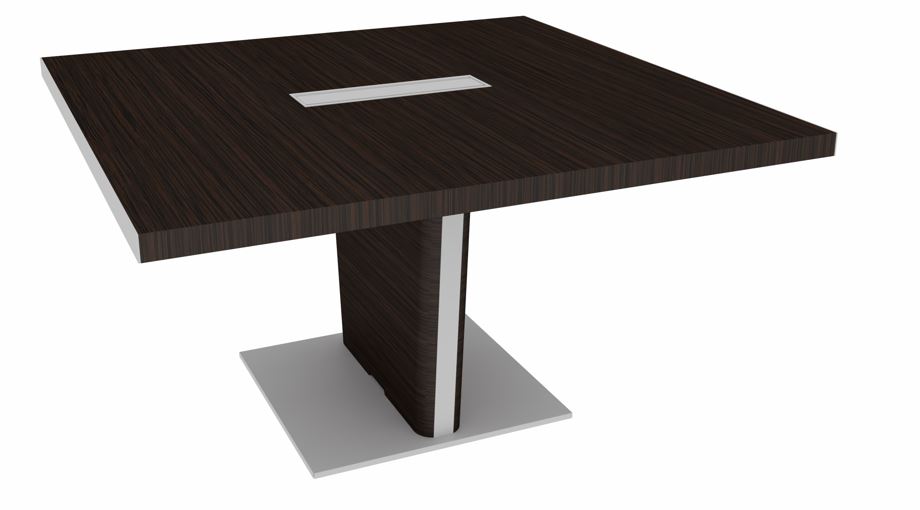 Table de réunion avec plateau réalisé en aggloméré épaisseur 18 mm, en placage bois épaisseur 0,6 mm, avec les côtés longitudinaux travaillés à folding pour avoir des bandes de hauteur 50 mm dans un seul pièce, avec chants périmétrales en bois épaisseur 1 mm, coins rayonnés 0,5 mm et verni transparent mat à pore semi-ouvert.