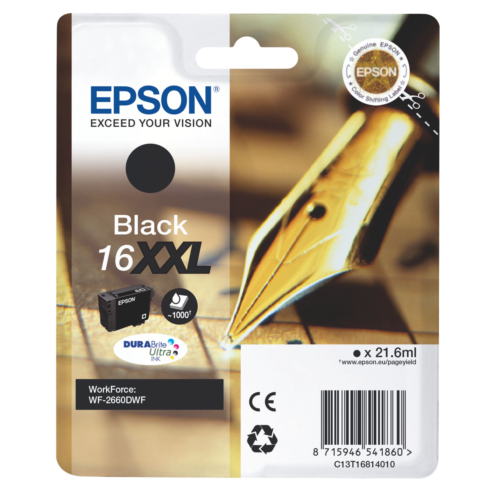 Andere Patronen mit den gleichen KompatibilitätenCartridge Epson 16 Einzelfarben3 Rezensionenab12,20 € ohne MwStEpson 16XL Pack Tintenpatronen-Set mit 4 Farben hoher Kapazität für Tintenstrahldrucker33 Rezensionen98 € ohne MwStCartridge Epson 16XL Einzelfarben8 Rezensionenab24,85 € ohne MwStCartouche Epson 16XL in hoher Kapazität Schwarz für Tintenstrahldrucker23 Rezensionenab27,35 € ohne MwStBig Pack Tintenstrahldrucker Epson 16XL2 Rezensionen115 € ohne MwStPack von 4 Cartridges Epson 16 Schwarz + Farbig14 Rezensionen51,34 € ohne MwSt