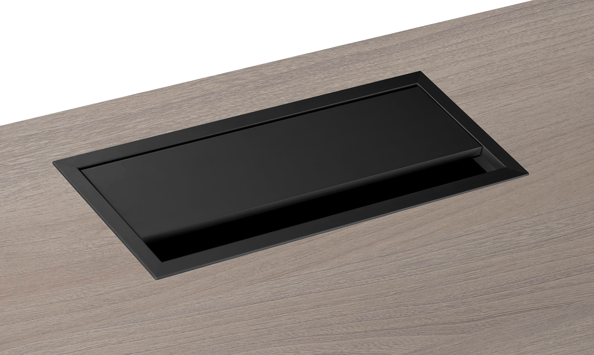Passt zum Schreibtischplatte ECLA, um den Zugang zu Kabeln oder Mehrfachsteckdosen zu ermöglichen. Aus Metall, weiß oder Aluminium. Maße: H 1,3 x B 24 x T 10 cm.