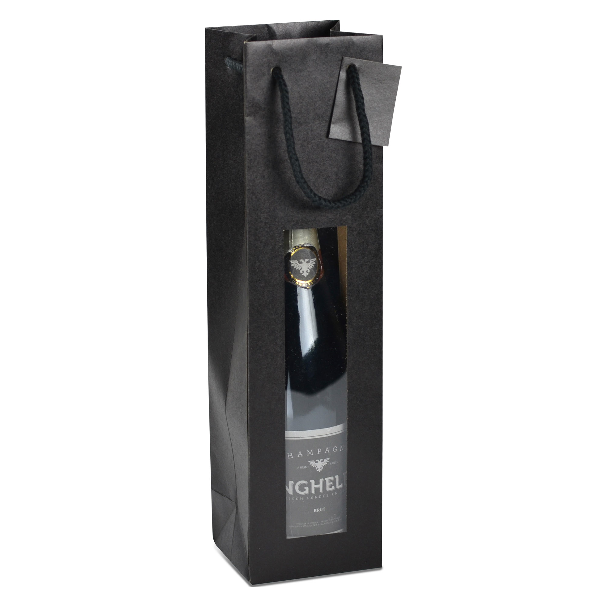 Tragetasche für Flaschen aus schwarzem Kraftpapier mit Fenster und Schnüren als Griffe - 20 Taschen