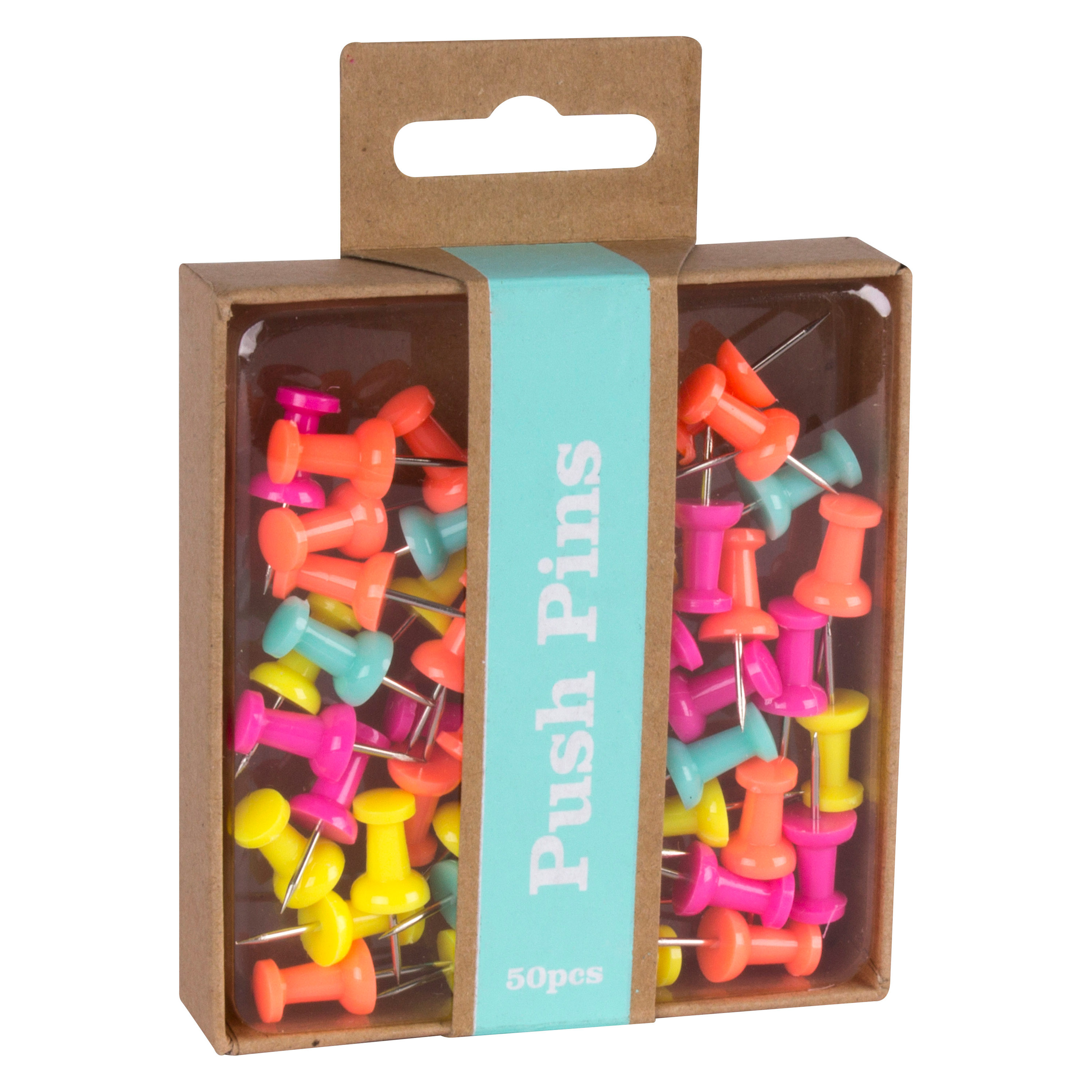 The box contains 50 fluorescent push pins in bright and attractive colors: fuchsia, yellow, orange, and turquoise. These vibrant colors allow you to personalize your space and bring your displays to life.