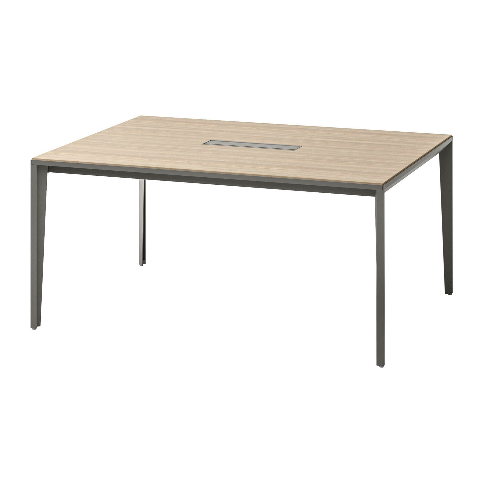 The design is characterized by its tapered metal legs, adding refinement and great stability. Featuring a central top access and a cable management tray under the table top, it is equally functional for connecting various electrical devices such as PCs, speaker systems, and video conferencing equipment.