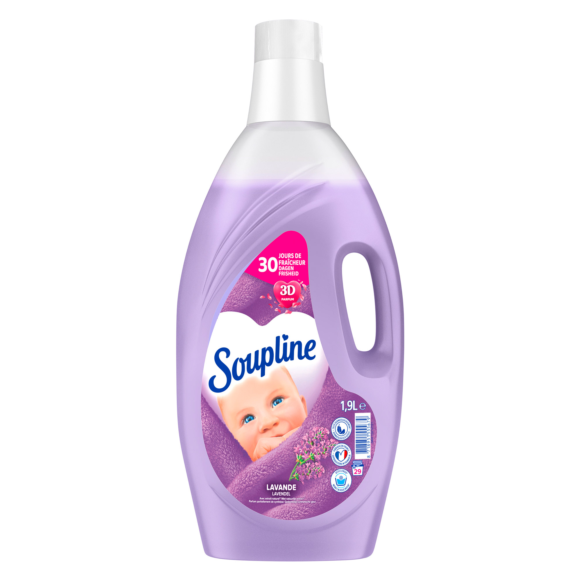 Detailled descriptionDiscover the new formula of Soupline Lavender in diluted format, now with 30 Days of guaranteed freshness!With its new revolutionary 3D fragrance, enjoy a unique combination of 3 technologies for an unprecedented sensory experience. Give your laundry an intense fragrance while benefiting from the unparalleled softness of Soupline.An active formula even at cold temperatures with 92% natural ingredients for environmental respect.1.9 L Can.