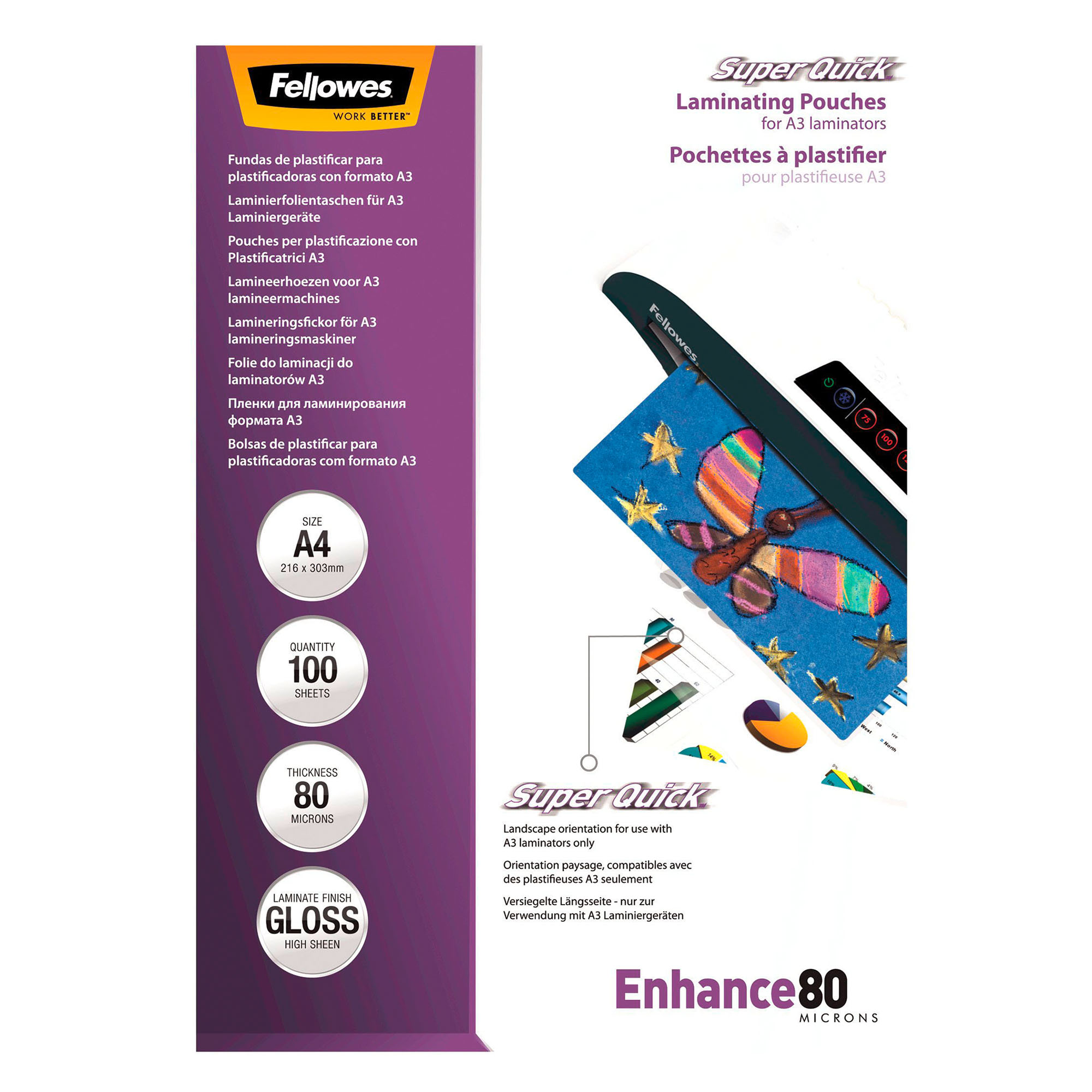 Ensure optimal protection for your documents with Fellowes SuperQuick laminating pouches. Sealed on the longest side (unlike standard pouches sealed on the shorter side), they allow you to laminate your A4 documents up to 40% faster. They are compatible with all brands of hot laminators accepting A3 format (as they are inserted from the wider side). Transparent in color and with a glossy appearance, these laminating pouch models allow for easy identification and highlighting of their content.