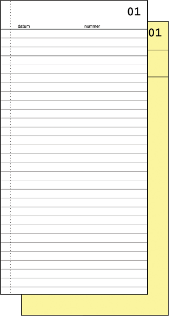 * 2x50 pages. * Numérotées. * Avec carbone. * Dimensions 210x105mm. * Numérotage continu sur l’original et la copie. * Copie en couleur pour une meilleure organisation. * 1ère et 2e feuilles imprimées. * 1ère feuille détachable grâce aux mircro-perforations. * 2e feuille sans perforations pour laisser dans le cahier. Certificat FSC. * Formulaire en néerlandais.