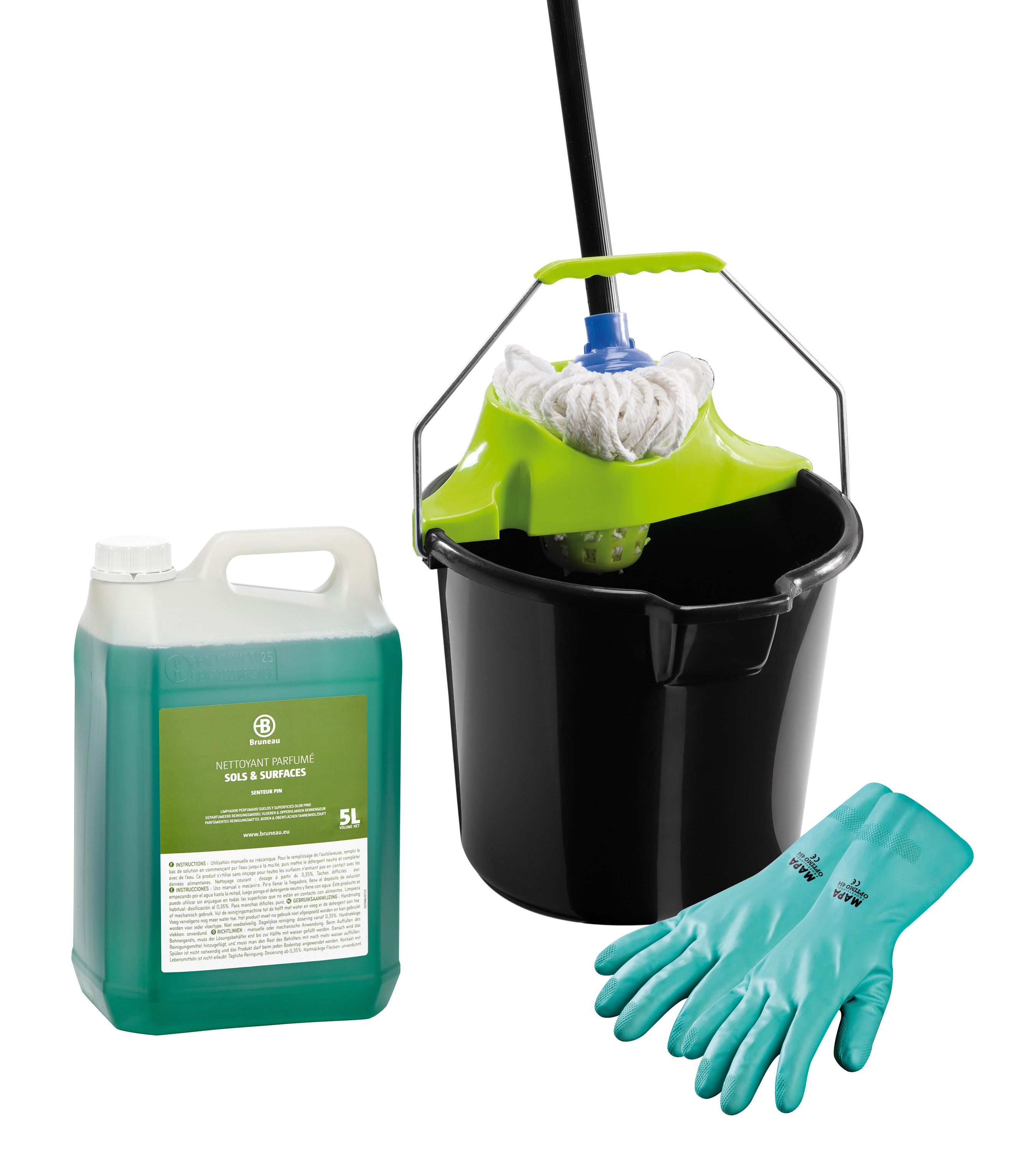 Detailled descriptionContains a bucket of 14 l in reinforced plastic with wringer and grip, a Spanish fringe, an aluminium handle, a pair of hypoallergenic gloves in size 7 and a can of 5 l Bruneau cleaning product for floors and surfaces, odour pine.