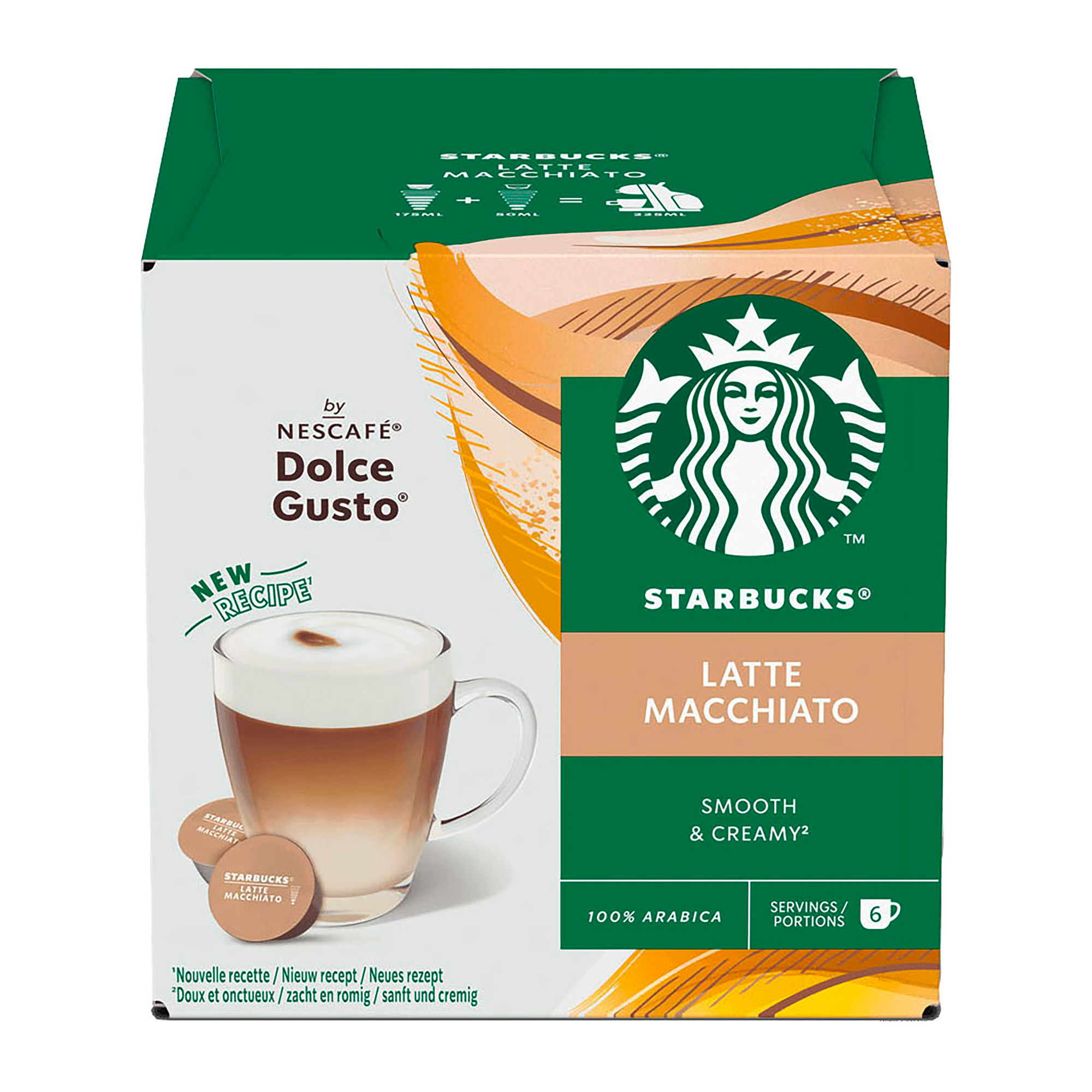 Detailled descriptionDiscover the creamy STARBUCKS® latte macchiato with hot milk, espresso, and a generous milk foamAromatic coffee and creamy foamLatte Macchiato2 boxes of 12 Dolce Gusto capsules (1 box of 12 capsules corresponds to 6 coffee pods and 6 milk capsules, making 6 drinks).Compatible with all Dolce Gusto capsule coffee machines sold by Bruneau.