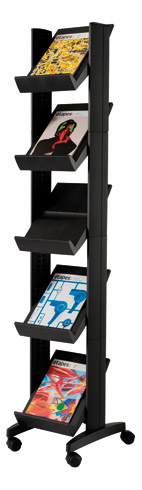 Metal structure with profile in polystyrene. 5 shelfs injected with polystyrene. Large capacity: accepts all sizes of documents up to 24 x 32 cm, frame of 4 cm. Adjustable shelfs, every 2cm and orientable 0-45° and 75°. 4 rotating wheels. Easy to install, without screws. 2 models.Large model: total dimensions: H 167,5 x W 85,5 x D 38,5 cm. Dimensions shelf: W 78 x D 32,7 cm.Compact model: total dimensions: H 167,5 x W 35 x D 38,5 cm. Dimensions shelf: W 27,5 x D 32,7 cm.