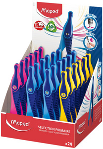 Le Compas Kid'z sans bague d'adaptation, présentoir de 24 de la marque Maped est un outil idéal pour initier les enfants à partir de 6 ans au tracé de cercles et de courbes. Ce compas en plastique est conçu pour assurer la sécurité et le confort des jeunes utilisateurs grâce à ses caractéristiques innovantes.