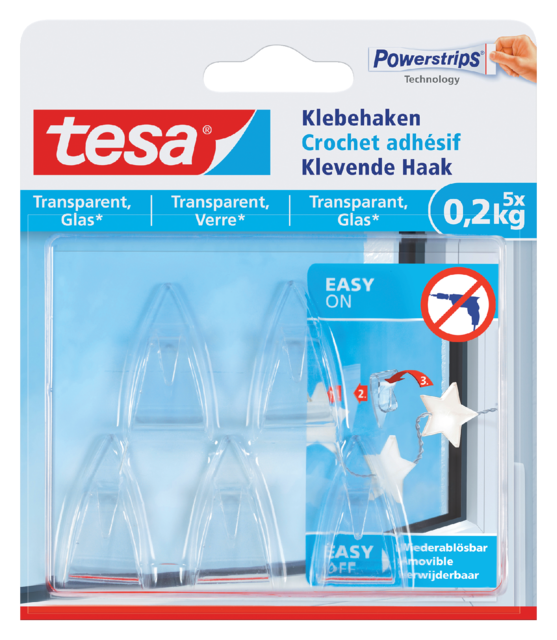 * Chaque crochet tesa® transparent a une capacité de charge allant jusqu'à 0,2 kg. Idéal pour toutes sortes de décorations sur des surfaces transparentes. * Ils sont idéaux pour les surfaces transparentes et dures telles que les fenêtres, les portes en verre et les miroirs et permettent de suspendre des décorations et des objets de manière invisible. * Grâce à la technologie Powerstrips®, ils peuvent être retirés sans laisser de résidus d'adhésif ni causer de dommages. * Le crochet peut être réutilisé avec une nouvelle languette adhésive transparente. * Pour surfaces transparentes à l'intérieur de la maison. * Jusqu'à 0,2 kg par crochet adhésif. * Démontable sans trace. * Réutilisable avec une nouvelle languette adhésive. * Résistance limitée aux UV. * Contenu de l'emballage : 5 crochets + 8 languettes