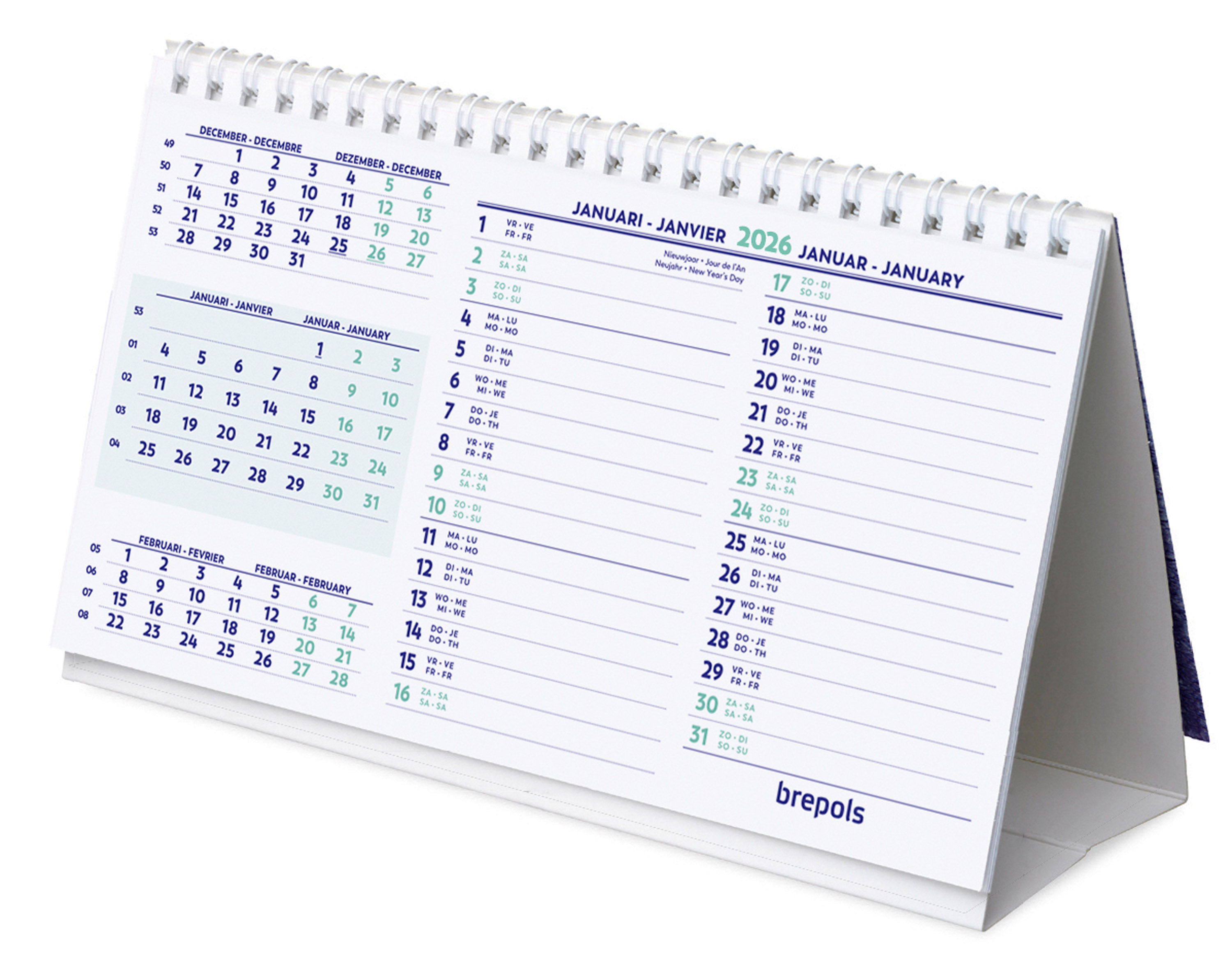 Practical, each month includes a reminder of the previous month and the following month on the side.