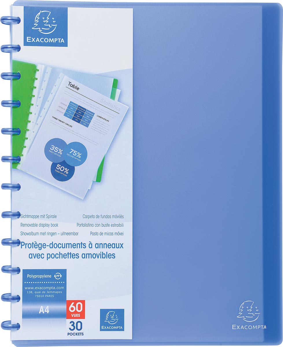 Display Book PP with Removable pockets - 30 pockets - A4 This display book with removable pockets so that you can modify the classification flow without having to insert documents again. Thanks to its rigid polypropylene 0.8 mm, it is very resistant and keep contents secure. The pockets are in grained transparent polypropylene.