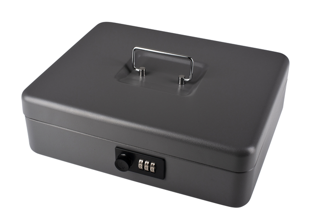 Detailled descriptionCoin box with Pavo 30 cm code.Steel sheet, metal 0.8 mm thickEpoxy paint finish (anti-fingerprint)Removable inner tray with 5 compartmentsMetal and recessed carrying handle3-digit security codeColor: GrayDimensions (w x h x d): 30 x 9 x 24 cmWeight: 1.69 kg