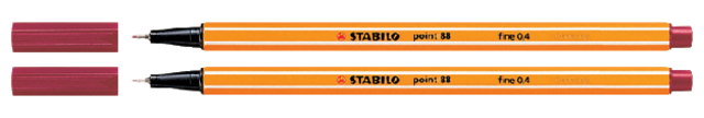 * Le fineliner pour écrire, dessiner, esquisser. * 25 couleurs magnifiques. * Écrit aisément. * Idéal pour travailler avec règle ou gabarit grâce à la pointe gaînée de métal. * Longue écriture. * Ne sèche pas, même sans capuchon un temps donné. * Encre à base d'eau. * Largeur de trait: 0,4mm.Le Point 88 : le fineliner idéal pour écrire, dessiner, esquisser et souligner. Grâce à la large gamme de couleurs, y compris les couleurs pastel et néon, vous avez un choix créatif complet à portée de main. La pointe en métal et l'excellente protection contre le dessèchement garantissent une qualité élevée et font de la pointe STABILO 88 un fineliner durable sur lequel vous pouvez compter tous les jours. Grâce à sa pointe gainée de métal, le fineliner est idéal pour une utilisation combinée avec une règle ou un pochoir, plus de taches gênantes. Parfait pour les idées créatives, à la maison, à l'école ou au travail. Le Point 88 est très durable, le capuchon et le corps du stylo sont composés à 96% de plastique d'origine biologique selon l'approche de l'équilibre de masse. * Fabriqué en Allemagne * Capuchon et corps du stylo fabriqués à 96% en plastique biosourcé selon le principe de l'équilibre des masses * Idéal pour une utilisation en combinaison avec une règle ou un pochoir, grâce à la pointe revêtue de métal * Pointe robuste, revêtue de métal pour une longue durée de vie * Peut rester longtemps sans capuchon sans sécher * Epaisseur du trait 0,4mm * Capuchon s'adapte au dos du stylo * Capuchon ventilé * Disponible en 65 couleurs * Fineliner STABILO point 88 en rouge foncé (50).