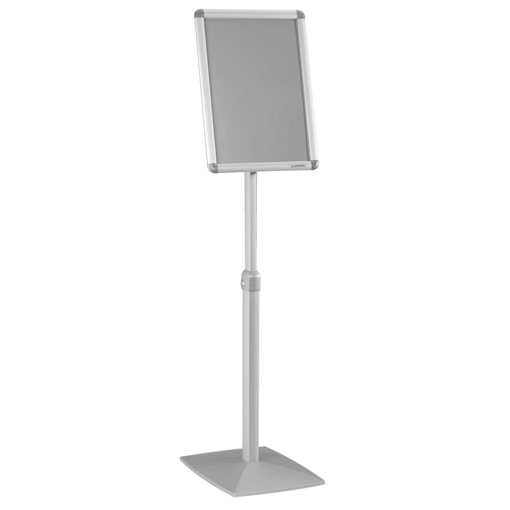 Multidirectional frame, vertical or horizontal. Bendable. Size frame: H 33 x W 45 cm. Thickness 25 mm. Non-reflective plastic, protects your posters. Total max. height (in vertical position): 131 cm. For documents up to size 29,7 x 42 cm. Visibility of your document: 27,9 x 40,2 cm.Undercarriage adaptable in height, with a blocking system. Thanks to the clipframe opening at the front, you can insert very easily documents in the display: the 4 frame borders can be opened and closed with a simple click. Provided with a weighted basis for more stability. Dimensions: W 35 x D 25 cm. Weight: 6,5 kg. In anodized aluminium. Colour grey. Easy to assemble, delivered with screws.
