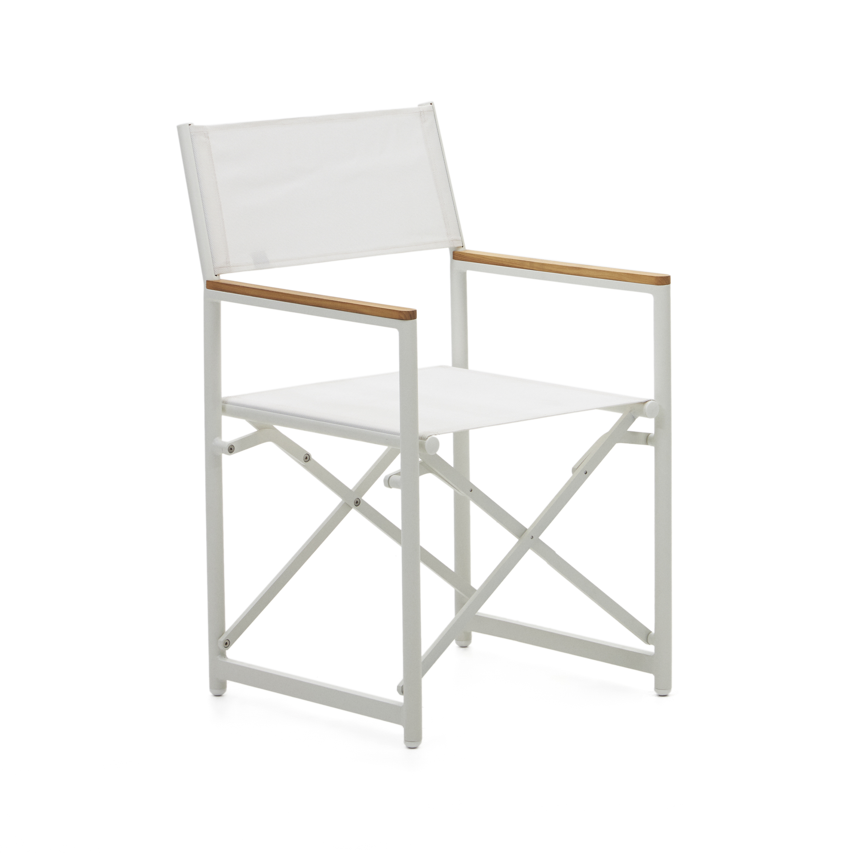 Foldable chair in aluminum with solid teak wood armrests.