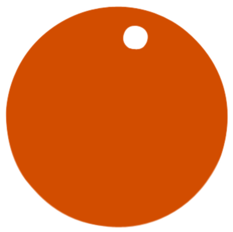 Detailled descriptionGB_Afgeronde hoeken en voorzien van één gaatje.Per pakket van 100 plaatjes.- Afm. (mm): Ø 50- Kleur: Oranje