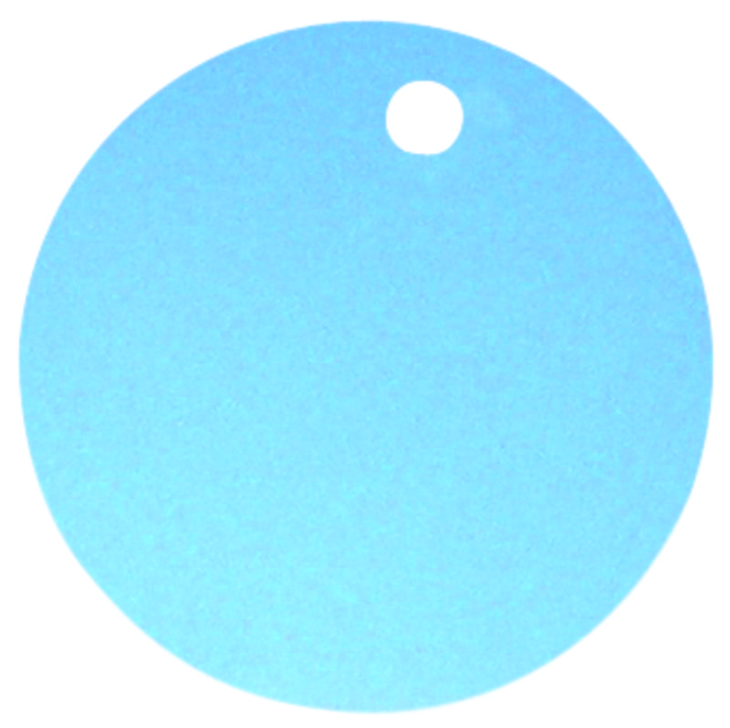 Detailled descriptionGB_Afgeronde hoeken en voorzien van één gaatje.Per pakket van 100 plaatjes.- Afm. (mm): Ø 50- Kleur: Lichtblauw