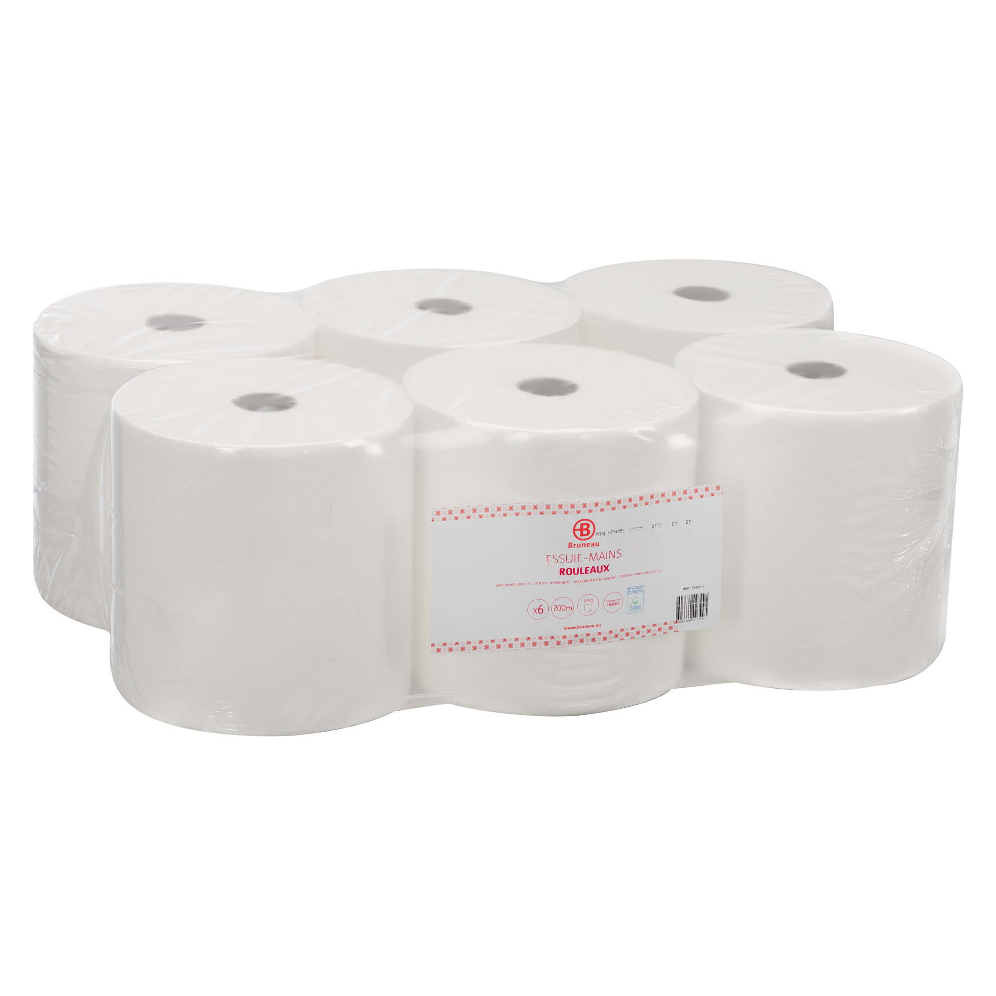 Pack of 6 rolls of hand towels for continuous 200m cutting devices. Featuring an embossed-bonded texture, Bruneau hand towels guarantee a good grip and good mechanical characteristics. Increased comfort during use. Presented in double thickness and in pure white cellulose wadding, it provides unparalleled softness.