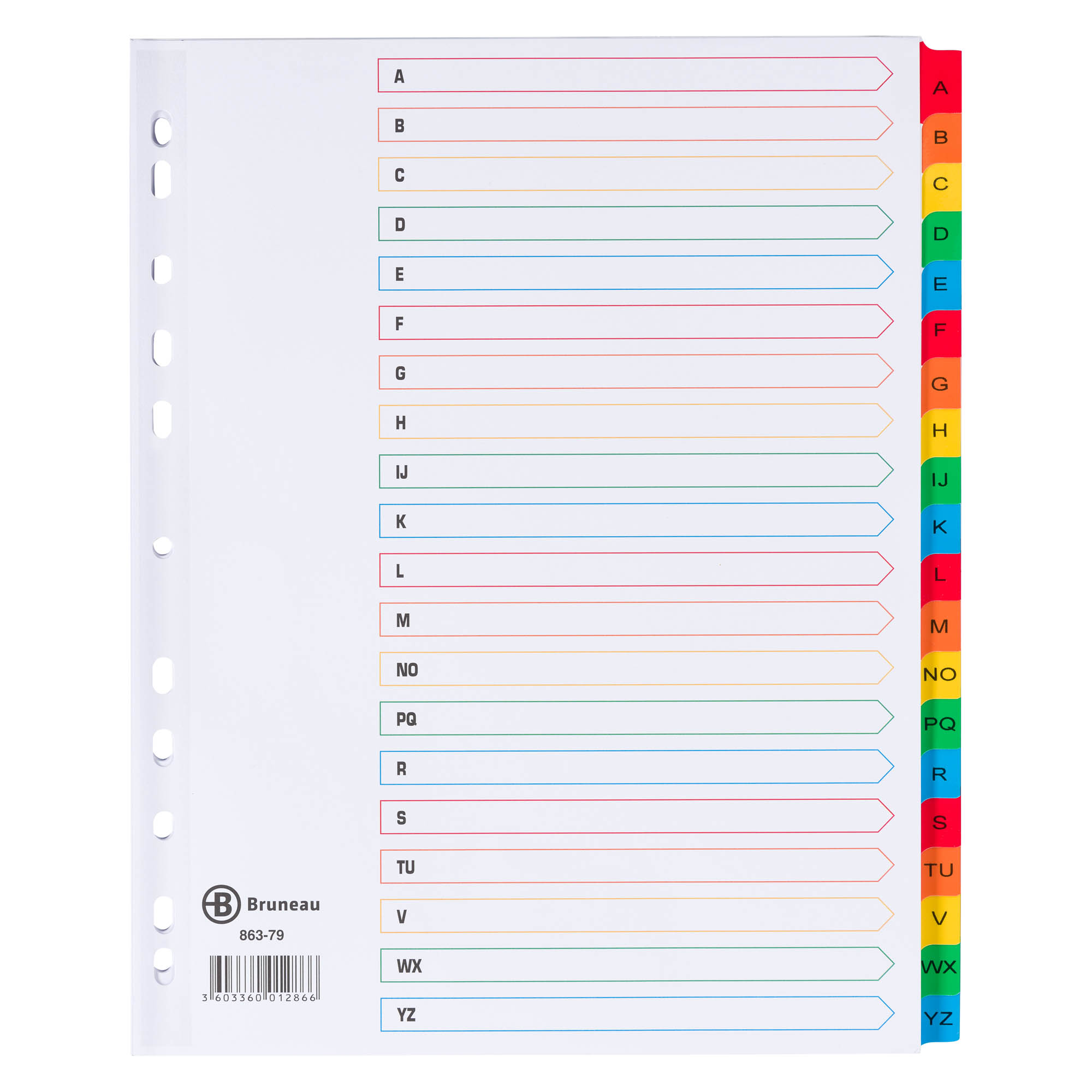 This product features 20 alphabetical dividers, reinforced with a plastic coating in five different bright colors to enhance its durability. Made of white bristol card of 170 g/m², this index tab is a guarantee of robustness.