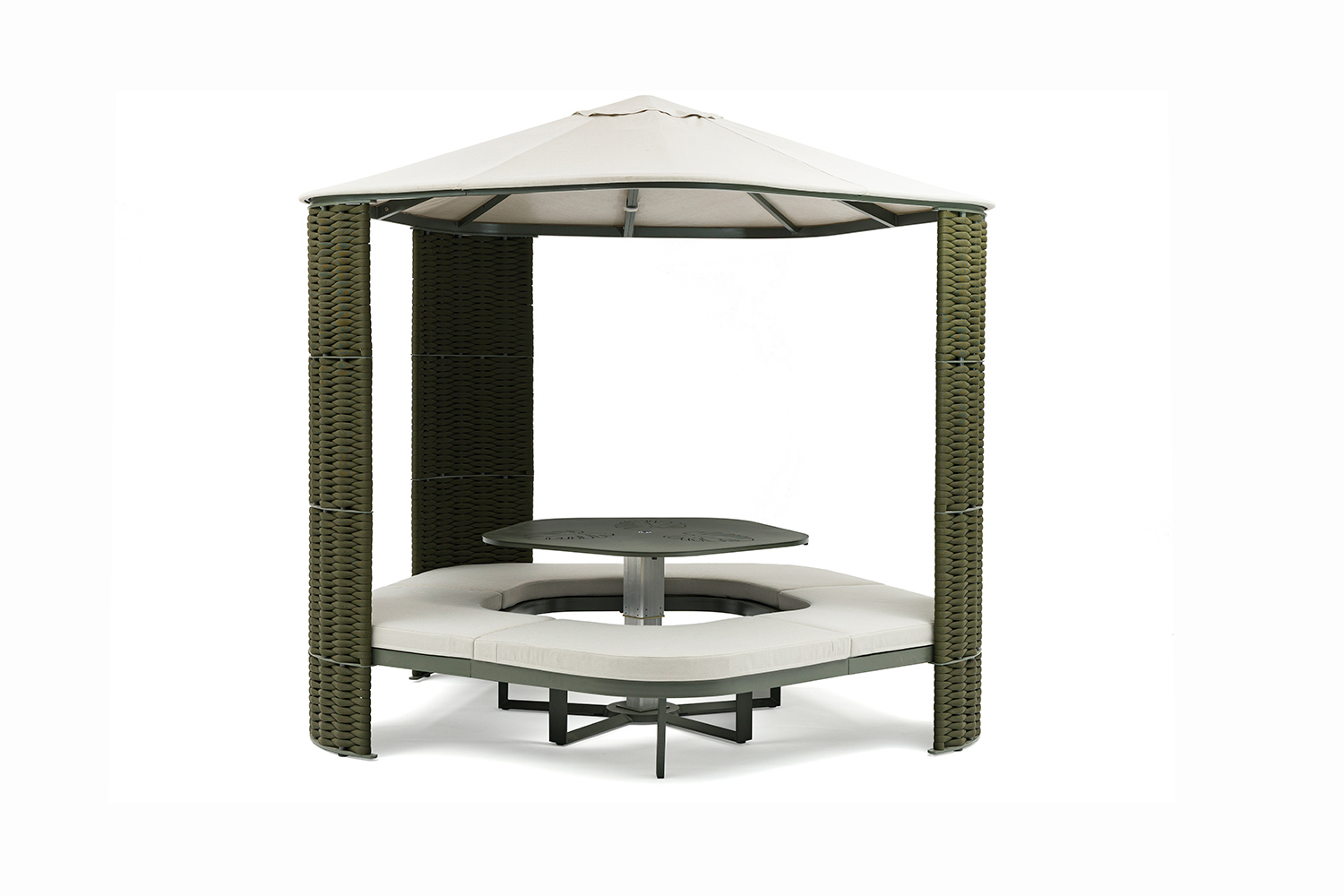 Kiosque spacieux et confortable, il apporte un ombrage et une grande plateforme matelassés pour la détente ou la sieste. Une table escamotable généreuse peut accueillir de 5 a 8 convives pour des repas a l'abri du soleil ou d'une averse. Toile Axvision résistante aux UV et déperlante, rideaux en option.