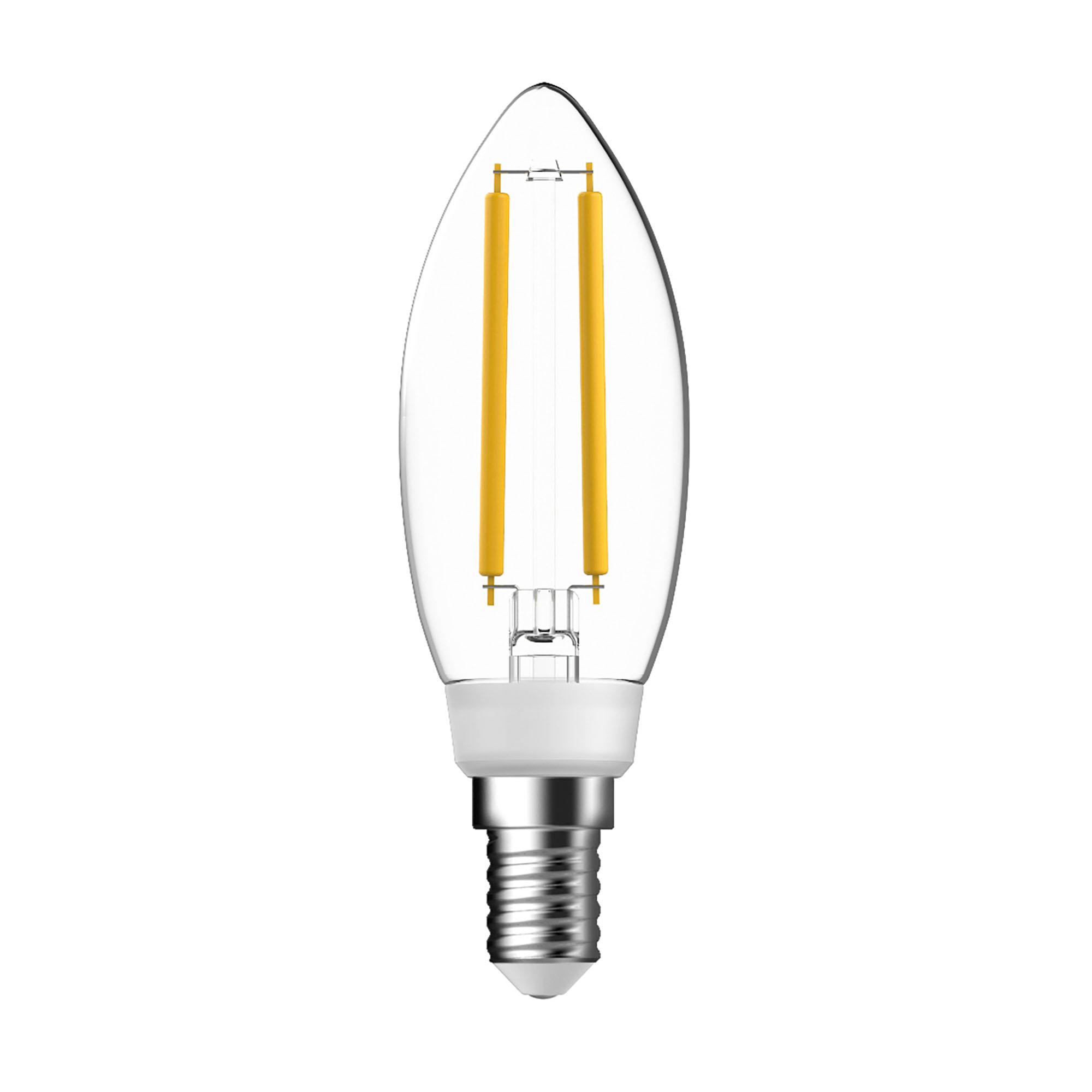 - Transparent flame bulb with a E14 base and warm light.