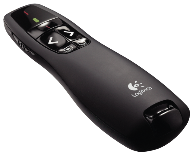 Logitech® Wireless Presenter R400 is designed to help you make your point. Its intuitive slideshow controls help you navigate through your presentation with confidence. Buttons are easy to find by touch. And its shape feels great in your hand. It’s got a red laser pointer that’s easy to see against most backgrounds and a range of up to 50 feet (15 meters), so you’ve got the freedom to move around the room and mingle with your audience. A storable plug-and-play wireless receiver makes it simple to get started—there’s no software to install. And when you’re through, the receiver stores inside the presenter to make packing up easy.