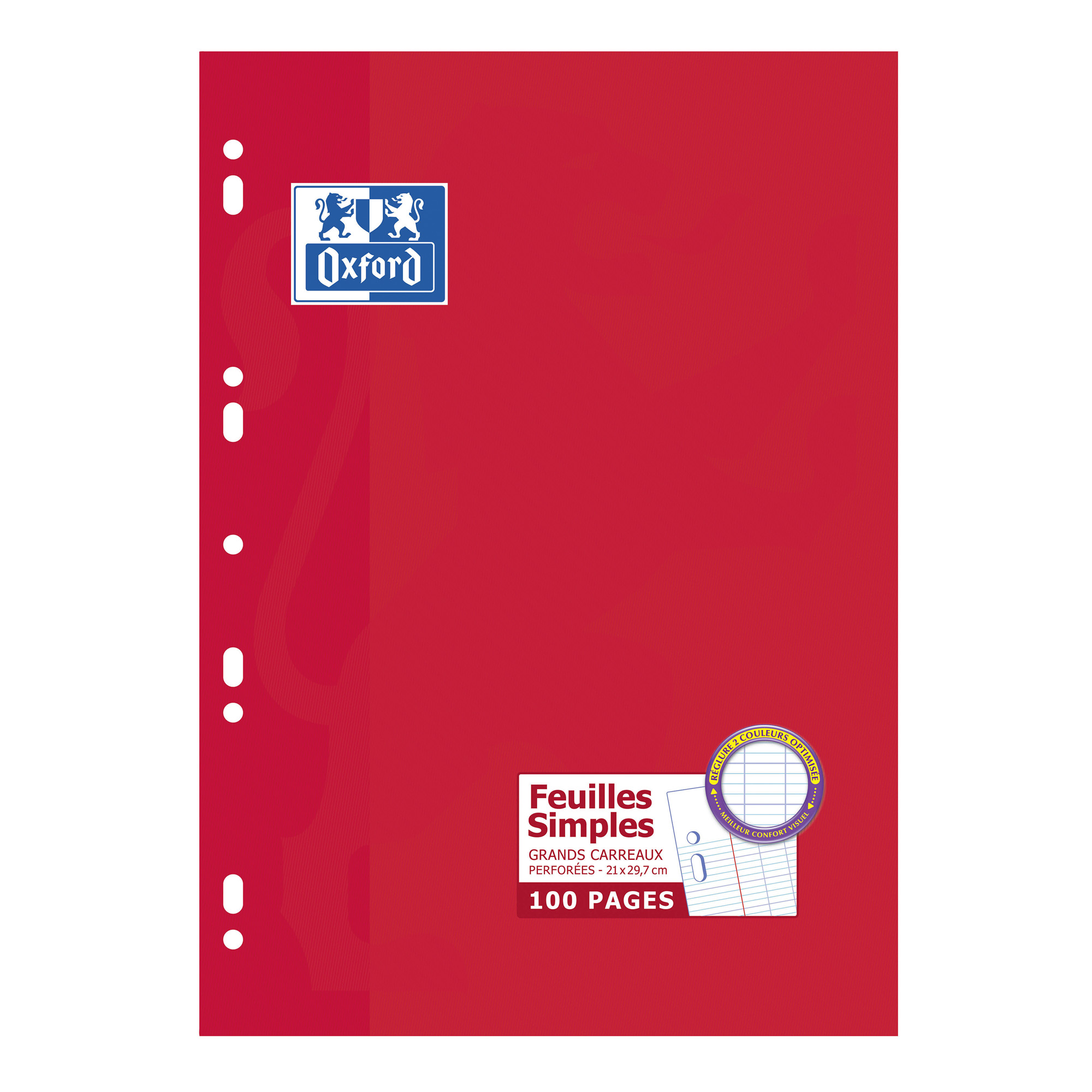 Les feuilles simples Oxford sont des produits intemporels et iconiques qui vous donnent confiance pour exprimer votre personnalité et votre potentiel. Le papier 90 g qualité Optik Paper que l'encre ne traverse pas, d'une blancheur parfaite et au toucher extra-lisse, offre un confort d'écriture inégalable. Ces 100 pages blanches de format A4 sont terminées par des coins arrondis qui les empêchent de se corner et de s'abîmer. La réglure grands carreaux seyès 2 couleurs avec marge à gauche assure une meilleure lisibilité pour l'élève. Elle a été développée en partenariat avec des ophtalmologistes et permet de réduire l'effet de la fatigue visuelle chez l'élève, tout en améliorant efficacement sa concentration.
