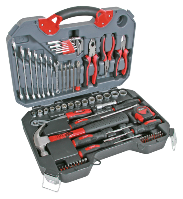 * Avec cette mallette d'outils complète de 78 pièces, vous êtes sûr d'avoir tous les outils à main nécessaires à votre disposition. Les outils sont fabriqués en chrome vanadium de haute qualité et répondent à des normes de qualité strictes. Vous pouvez donc compter sur la qualité et la longévité. * L'ensemble des outils est livré dans une mallette de rangement robuste, résistante aux chocs et dotée d'une poignée ergonomique, afin que vous puissiez emporter les outils partout avec vous. * Contenu : pinces coupantes, pinces combinées, pinces pointues, mètre ruban, marteau, jeu de clés allen, jeu de douilles, tournevis, embout