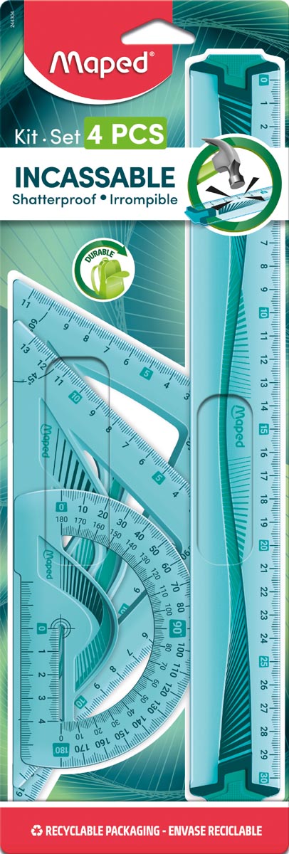 4 pièces: 1 latte de 30 cm, 1 équerre 45°/21 cm, 1 équerre 60°/21 cm et 1 rapporteur 180°/12 cm. Latte bi-matière (partie Soft confortable et anti-dérapante). Incassable. Couleurs assorties: bleu et vert.